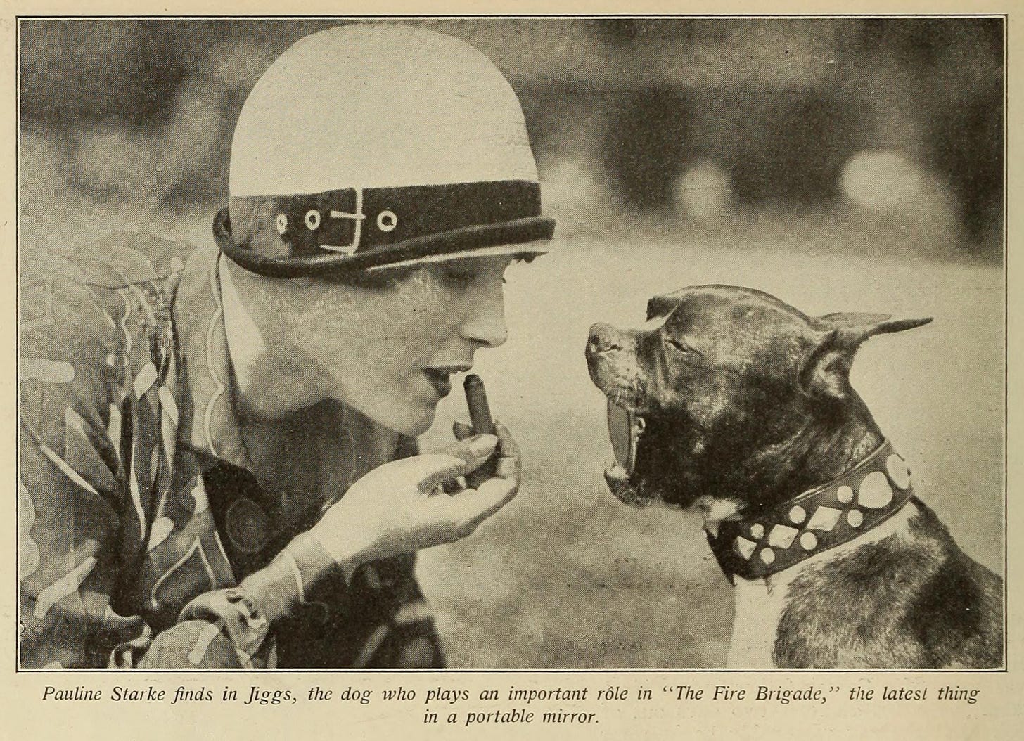 Although I had seen Jiggs in a few films, which I will mention in a bit, I had never heard the name before until I came across an image in the October, 1926 issues of both Photoplay Magazine and Picture Play Magazine, which shows Jiggs holding a lipstick mirror for actress Pauline Starke4. I immediately wanted to know more about this pupstar.