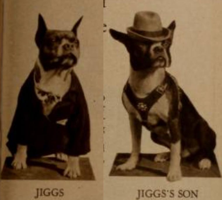 House also claimed that Jiggs can walk, that he has a “psychosis about mice” and loves to chase them, and that Jiggs often doubles in shots for dogs that cannot walk on two feet. The piece also “interviews” Jiggs, where the dog says they like movies, but that they live very quietly outside, never goes out socially, doesn’t care for the ladies7, and that his favorite food was hamburger. Allegedly, Jiggs could also say the words “hamburger” and “Mama.”