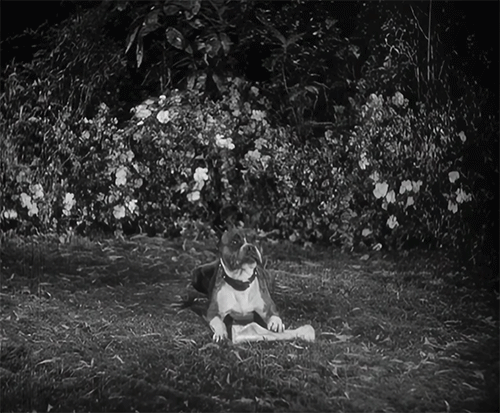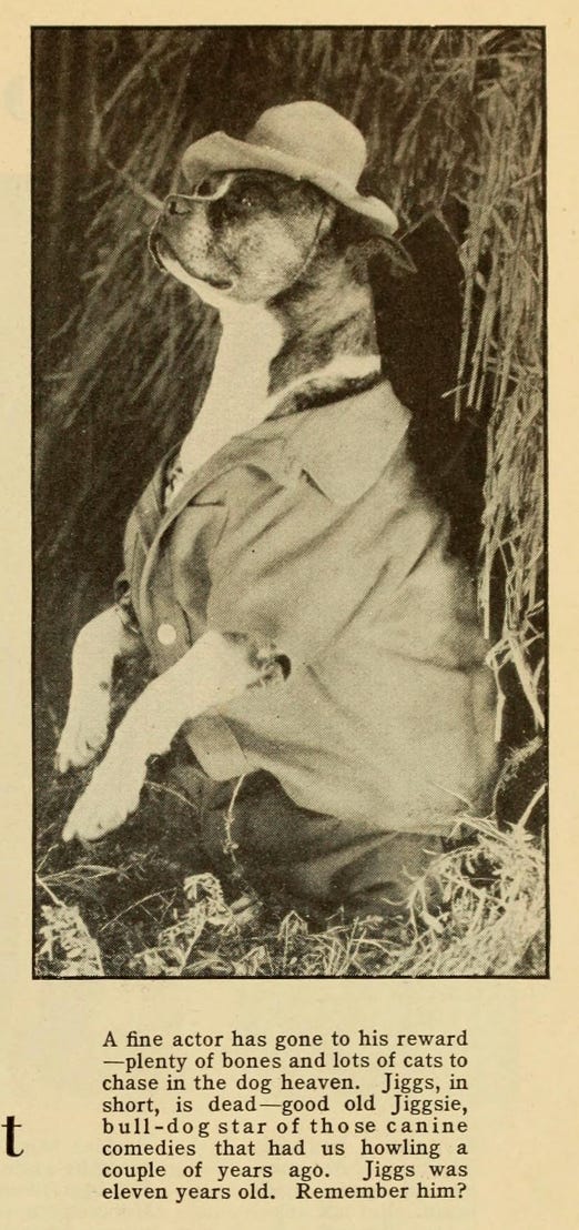 Jigg’s obituary appeared in the September, 1932 issue of Photoplay, where he was described as “that famous talking bull dog of the movies.” After listing various credits, the obit goes on to say that Jiggs “always gave an outstanding performance” and that he was eleven years old when he died. The pup was buried in a “tiny redwood casket made especially for him” and that one of his puppies died on the same day. The obit ends by insisting that the “movies will miss good old Jiggs. It will be a long time before his place can be filled.”