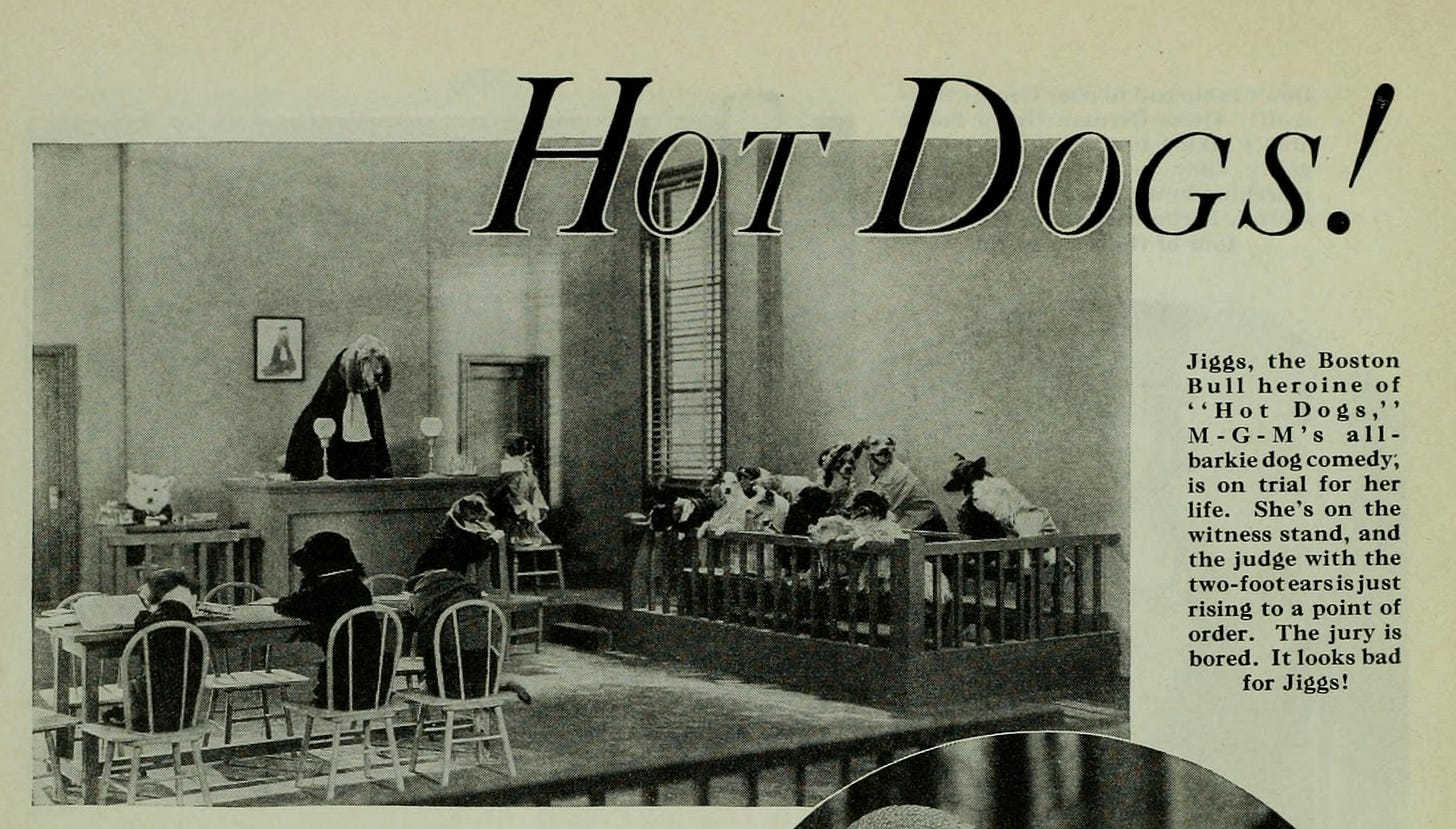 Although Jiggs was a male dog, in these barkies he often played female roles, as profiled in a January, 1930 issue of Picture Play Magazine. In this piece Jiggs is described as the first “pup female impersonator.” In the January, 1930 issue of Photoplay, the dog is described as the heroine of the Hot Dogs! series. In the series’ second film, entitled Hot Dog (1929), a parody of courtroom dramas like the Ruth Chatterton melodrama Madame X (1929), Jiggs plays a female character who ends up in a love triangle that results in a scandalous trial.