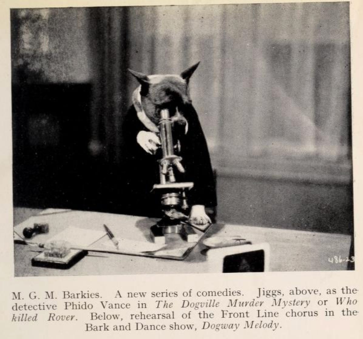 In the November, 1930 edition of Motion Picture Classic an article entitled “They’re In The Barkies Now” by Helen Louise Walker describes how Jiggs receives “voluminous fan mail” and sends out photographs to admirers all over the world. The piece goes on to describe Jiggs as a versatile actor who can play “old men and young flappers with equal verve and enthusiasm.” Allegedly, Meyers and White had thousands of costumes for these shorts and the dogs knew their own costumes. White is quoted as saying, “You should see the fireworks, if we try to put one dog’s costume on another! They can smell the difference, you know. And how they resent it!”
